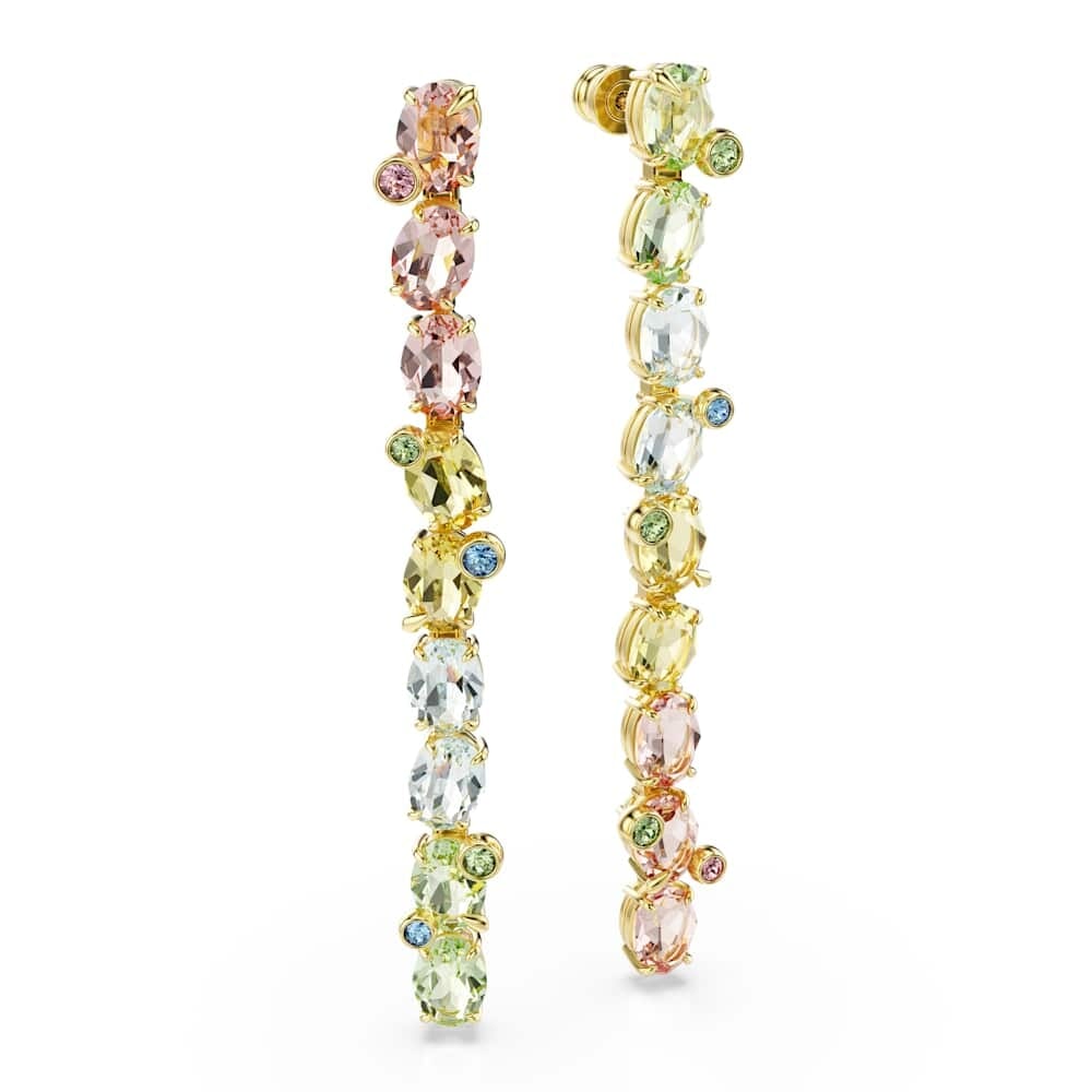 Inyecta color a tu estilo con estos vibrantes pendientes. Cada pieza bañada en tono oro presenta un largo strand de cristales grandes en múltiples tonos, junto con cristales más pequeños en un alegre engaste de garra con forma de burbuja. Divertidos, inesperados y listos para afrontar el día, estos pendientes en cascada se pueden combinar con un colgante o pulsera Gema para crear un look ultraalegre.