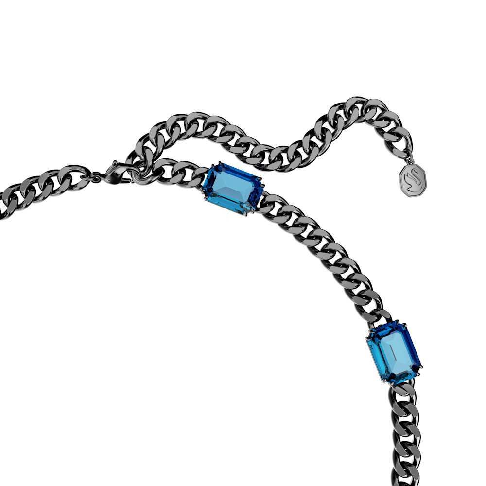 Este colgante Millenia lleno de contrastes combina tonos profundos y oscuros para crear su propio look espectacular. La cadena gruesa está bañada de rutenio negro y presenta un despliegue de cristales azules denim en un engaste de garra doble, mientras que el diseño se completa con un cierre de mosquetón y una única Swarovski Zirconia en el extremo del alargador. Un look atrevido con el que pasarás fácilmente de la mañana a la noche.