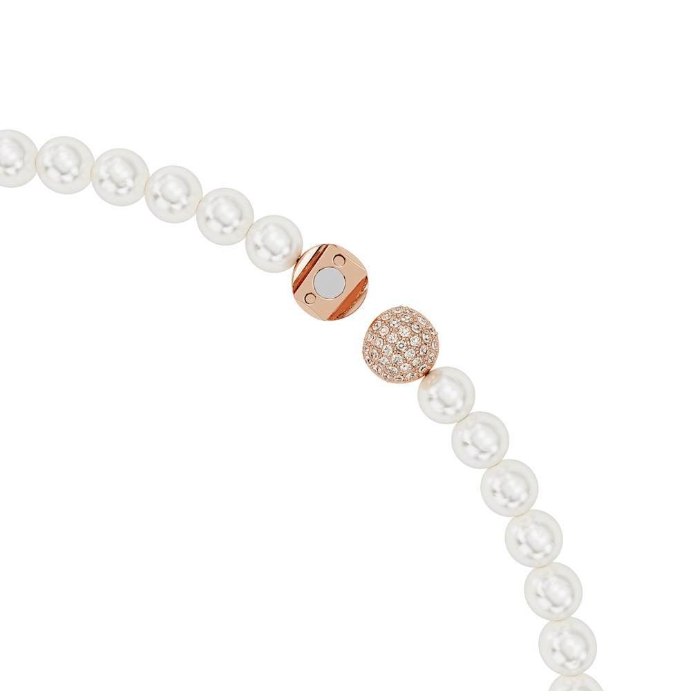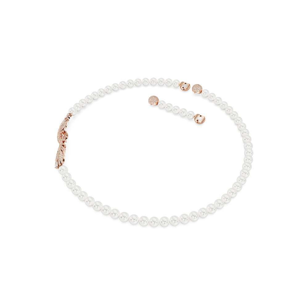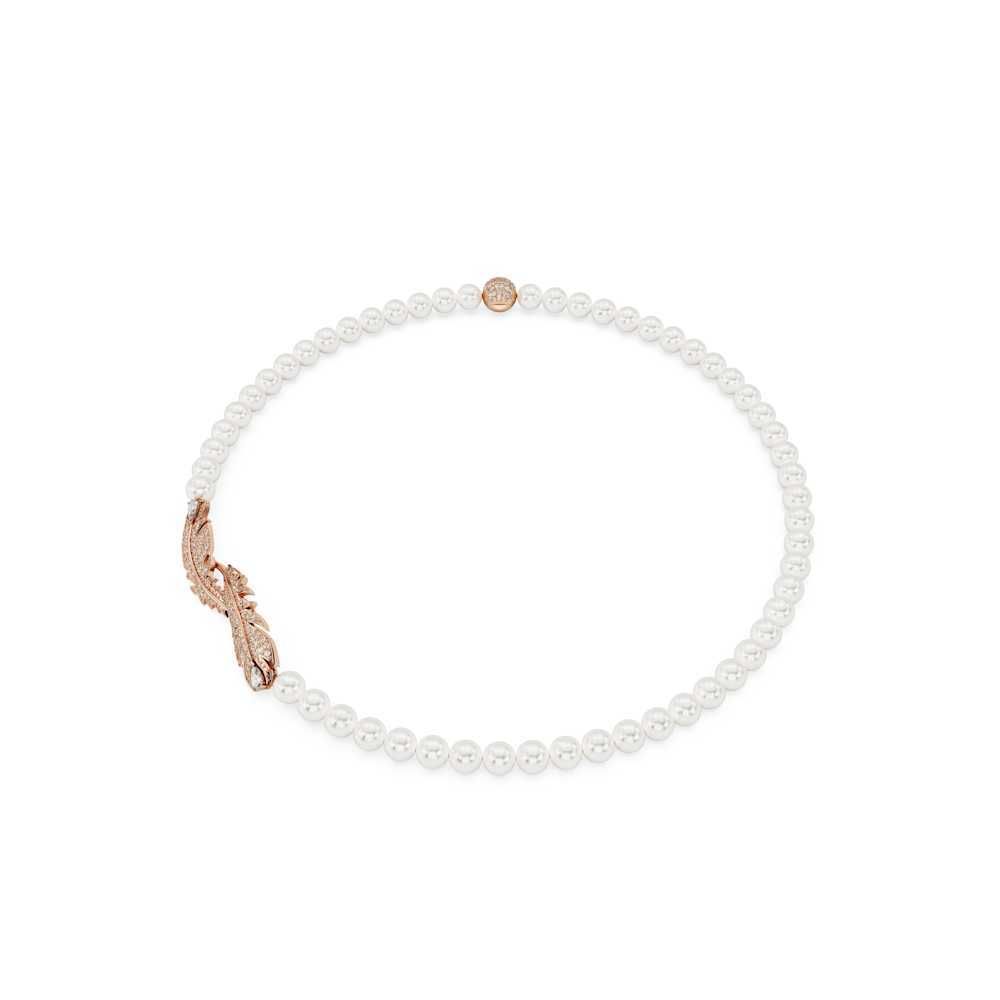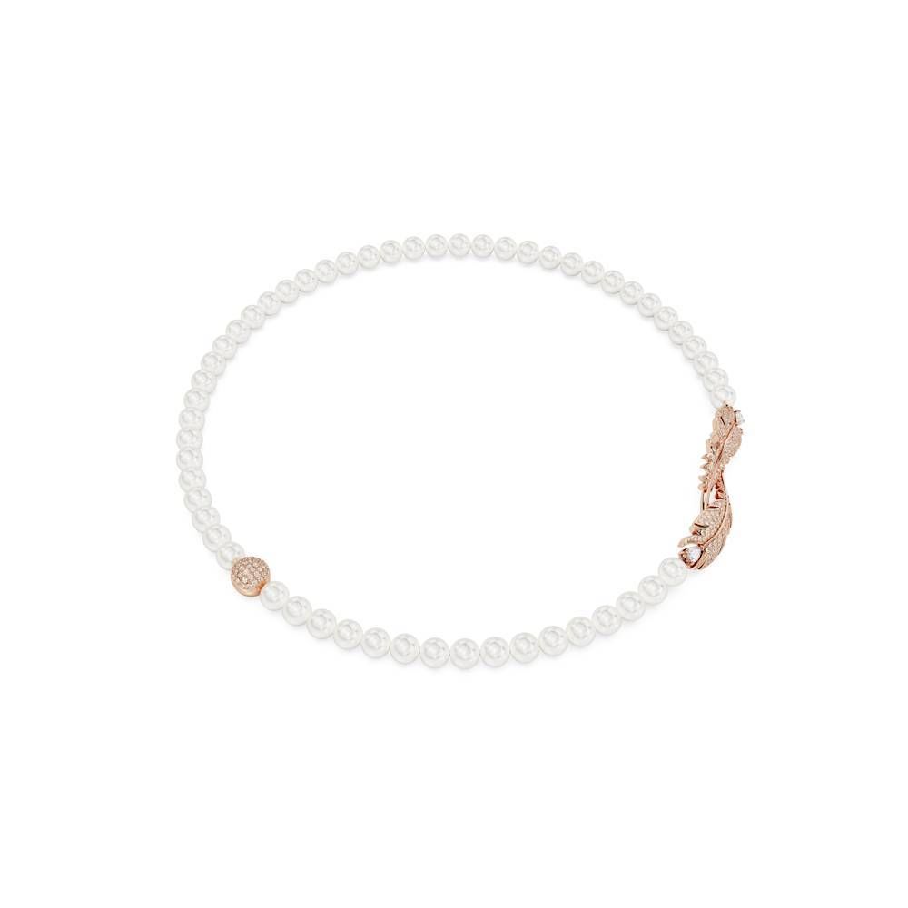 El arte se une a la imaginación en este collar inspirado en la naturaleza de la familia Idyllia. Una cadena de perlas de cristal blancas de Swarovski adornada con un par de plumas bañadas en tono oro rosa, con pavé rosa y una Swarovski Zirconia. Luce esta lujosa pieza con cualquier estilo que te propongas y brilla con tu máximo esplendor.