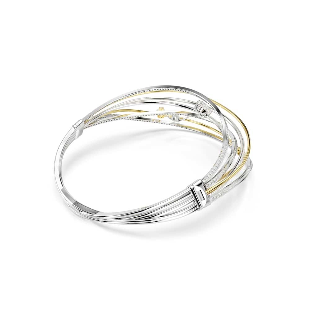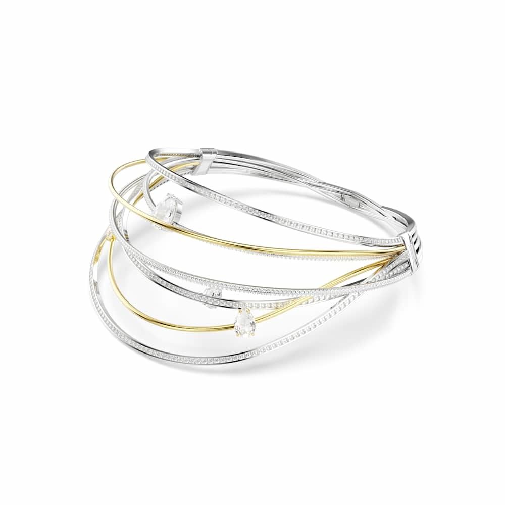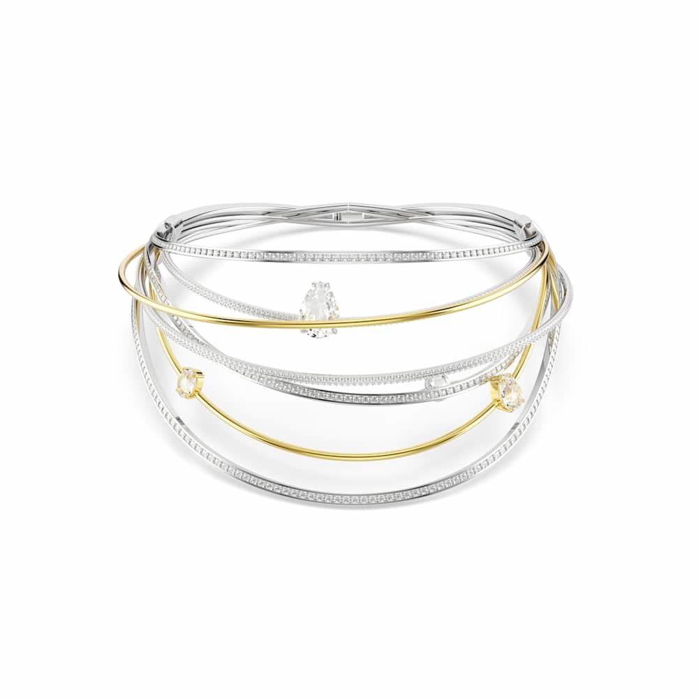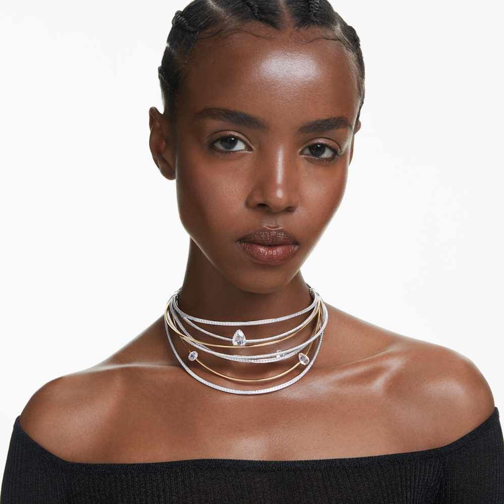 Esta hipnotizante gargantilla Hyperbola cobra vida con un derroche de luz y creatividad. El hipnótico diseño está elaborado con varias bandas bañadas en rodio y en tono oro, con Swarovski Zirconia transparentes en engaste de canal y de garra. Entre las bandas se han colocado cristales transparentes para crear un mayor impacto. Combina este intrincado accesorio con un brazalete a juego para crear un look repleto de glamour luminoso.