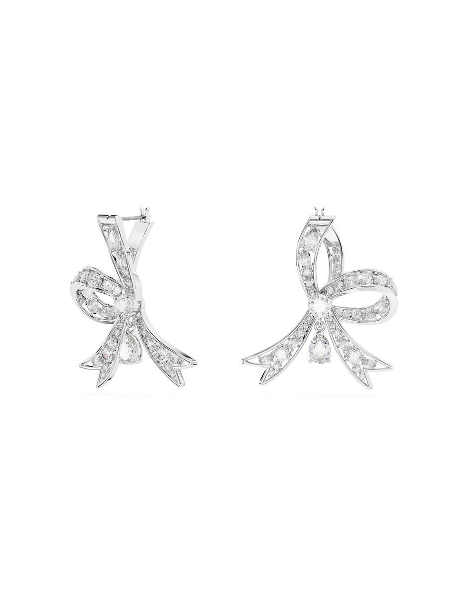 En lugar de llevar lazos en el cabello, ahora podrás llevarlos en las orejas. Estas elegantes caravanas con forma de lazo están bañados en rodio y adornados con una serie de brillantes cristales transparentes engastados mediante la técnica chattonage. Una piedra central transparente y una piedra colgante con forma de pera aportan los vibrantes toques finales. Estas caravanas de gota decorados serán un regalo de lo más romántico que atesorarán por siempre.
