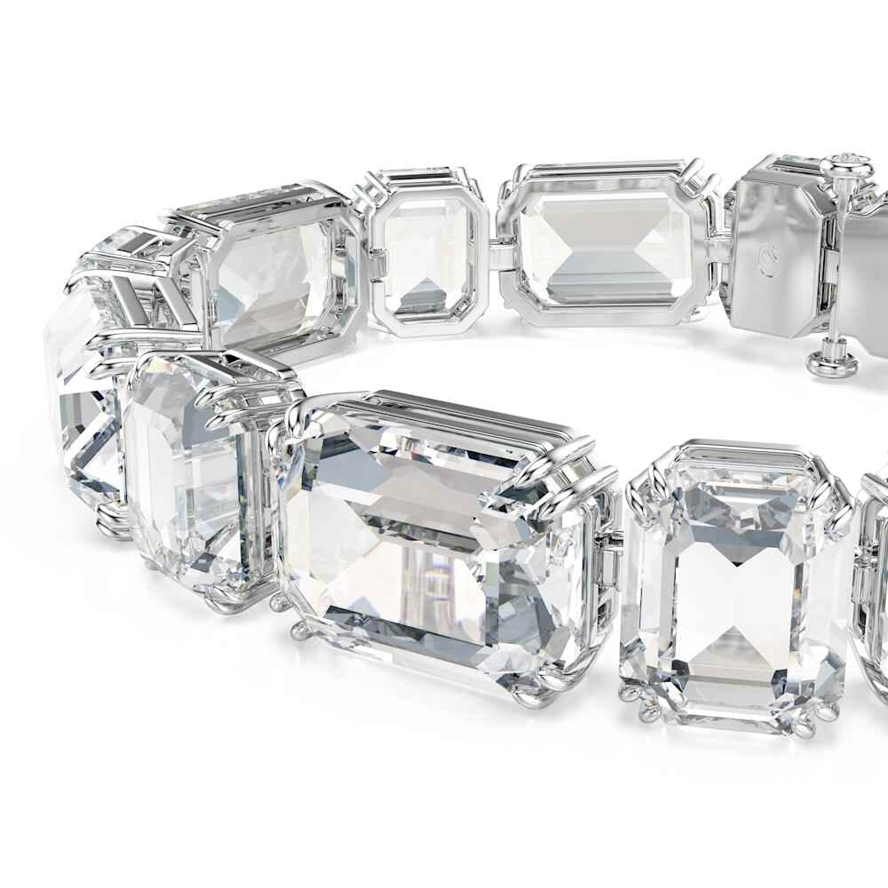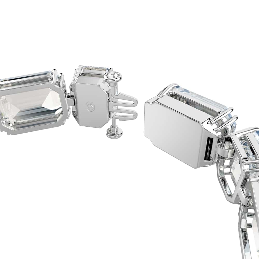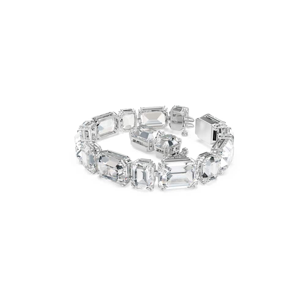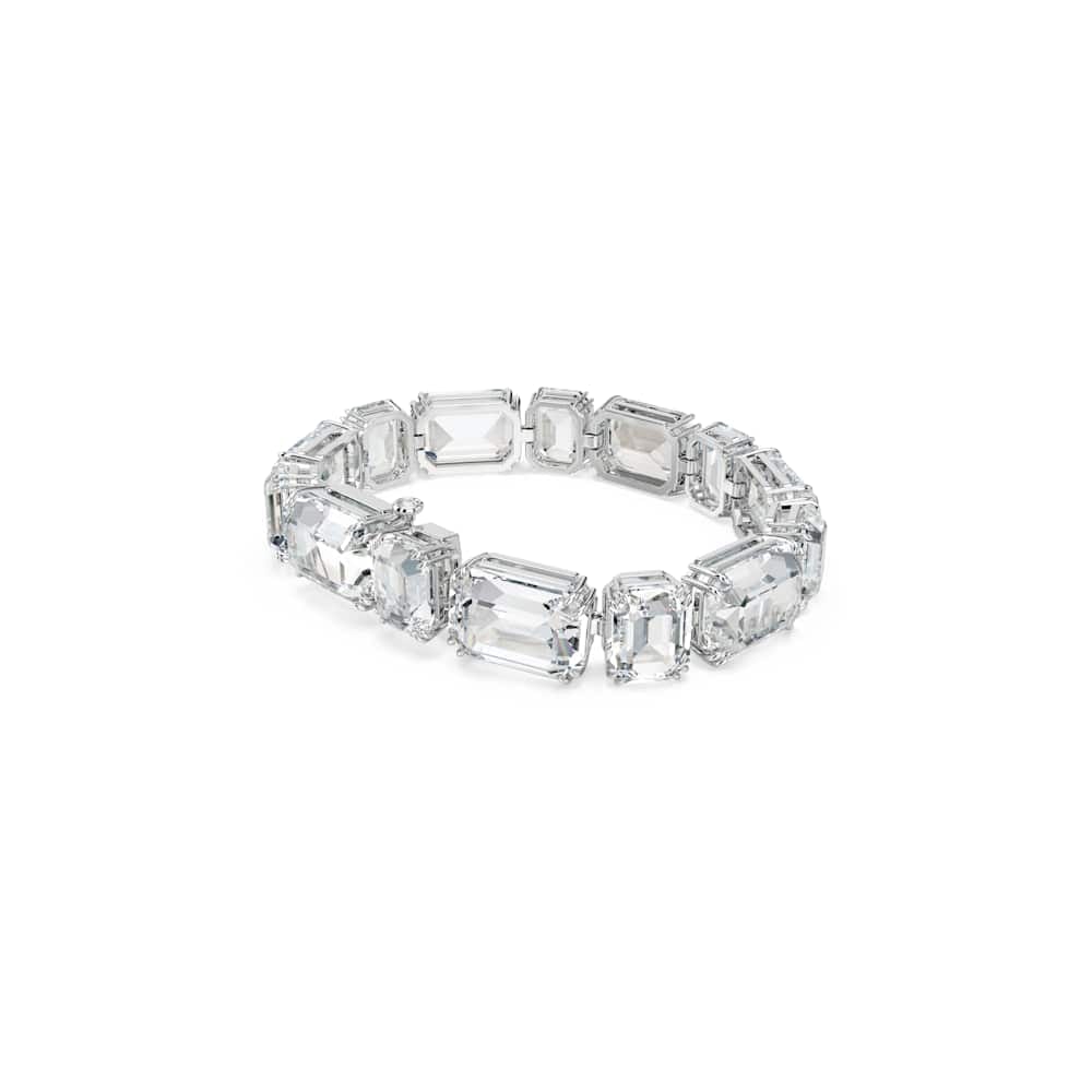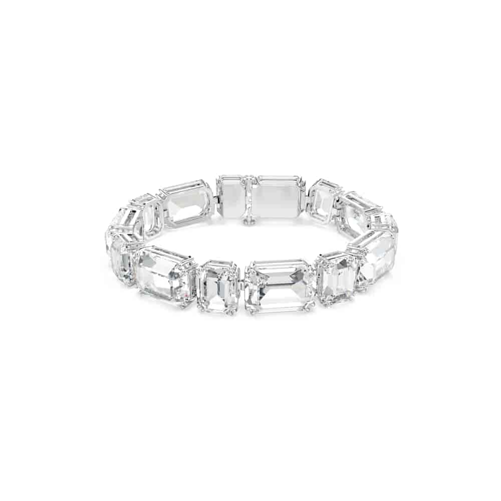 Déjate cautivar por el poder de la sencillez con esta impresionante pulsera Millenia. Este diseño bañado en rodio está adornado con cristales en talla octogonal transparentes que se alternan en posiciones horizontales y verticales. Con su atrevido alarde de luz, esta pieza puede realzar cualquier atuendo de día o de noche, y puede combinarse con un collar a juego para acentuar su brillo.